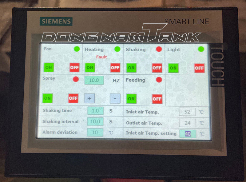 - Tủ điều khiển điện: Màn hình điện tử Siemens cao cấp giúp cài đặt thông số sấy như nhiệt độ, tốc độ cấp dịch, quạt gió,… Hoặc quý khách có thể chọn tủ điều kiện cơ học thì chi phí đầu tư sẽ rẻ hơn một chút.