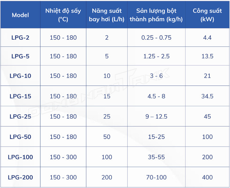 Thông số các dòng máy sấy phun ly tâm Đông Nam