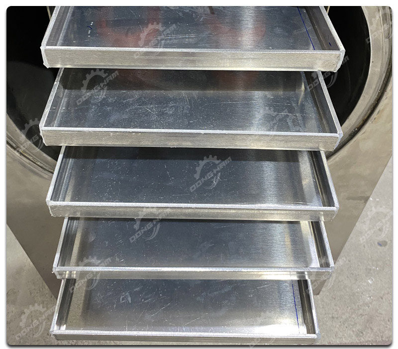 Gồm 5 khay sấy làm từ chất liệu hợp kim nhôm giúp truyền nhiệt tốt, chứa được nguyên liệu lỏng, đồng thời đảm bảo an toàn vệ sinh thực phẩm, dễ lau chùi.